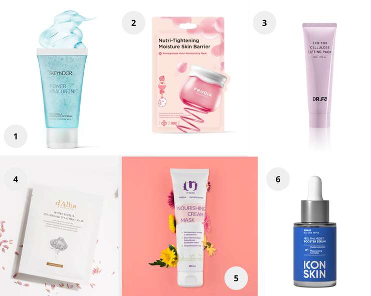 1. Успокаивающая гиалуроновая маска Power Masks, Skeyndor. 2. Питательная тканевая маска с гранатом, Frudia. 3. Маска-пленка с коллагеном, DR.F5. 4. Питательная маска для лица White Truffle Nourishing Treatment Mask, d’Alba. 5. Питательная маска Nourishing cream mask, The U. 6. Увлажняющая сыворотка-концентрат с гиалуроновой кислотой, Feel The Moist, Icon Skin.