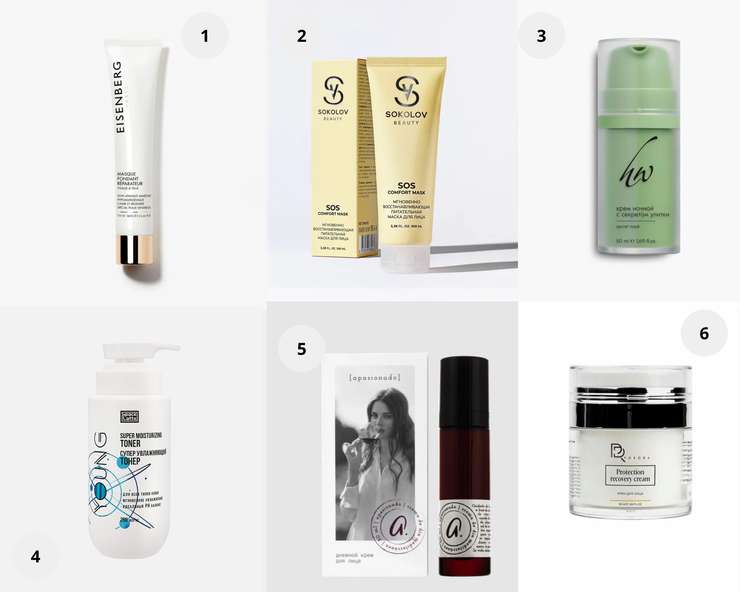 1. Восстанавливающая тающая маска, Eisenberg. 2. Маска для лица питательная восстанавливающая SOS COMFORT MASK, SOKOLOV BEAUTY. 3. Ночная маска c секретом улитки SECRET MASK, PREMIUM Homework. 4. Супер увлажняющий тонер для лица, Space.latte YOUNG. 5. Крем для лица дневной, Apasionado. 6. Увлажняющий крем для лица с витамином C и пребиотиками «Защита и восстановление», PORODA.