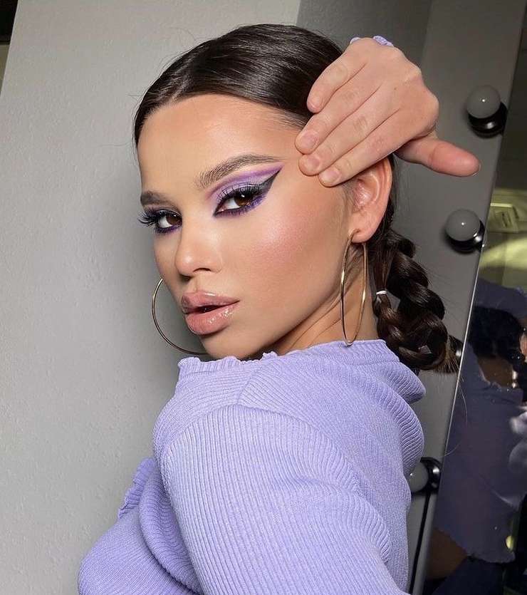 Остается в моде монохромный макияж. Но если вы боитесь переборщить со сложным лиловым оттенком, то можно использовать его в деталях: тени, растушеванные в прозрачную дымку, изящные цветные стрелки, фиолетовая тушь, блеск для губ с сиреневым отливом — выбирайте что-то одно.