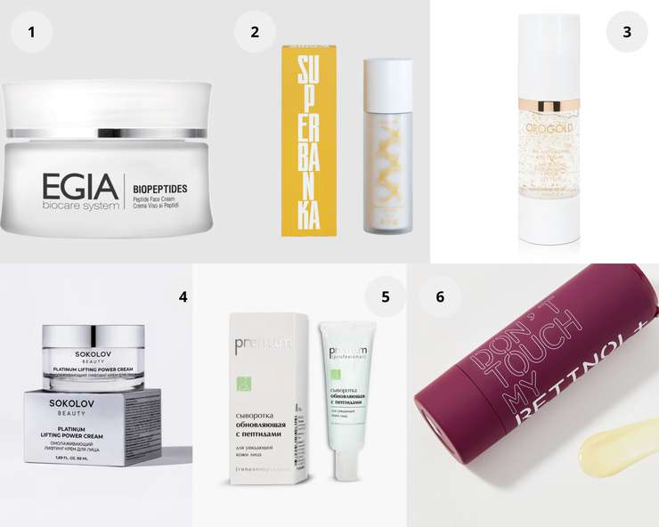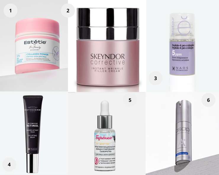 1. Лифтинг-крем для лица Collagen Power, ESTETIE. 2. Крем-филлер с пептидами Corrective, Skeyndor. 3. Сыворотка с пептид−4 про-коллагеном, Etat Pur. 4. Крем для области вокруг глаз Intensive Retinol, Institut Esthederm 5. Мультифункциональная концентрированная сыворотка с Пептидами и Ледяным вином, Буренка. 6. Обновляющая сыворотка с ретинолом супер А+, Аsap.