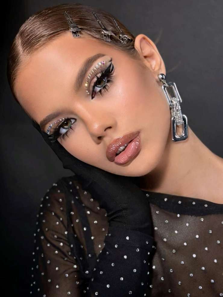 «Моя персональная рекомендация: прикрепите пару мелких страз в уголки глаз или вдоль линии стрелки. Так и образ не перегрузится, и выглядит макияж празднично. Также здесь важно подобрать качественный клей, чтобы декор не отвалился в самый неподходящий момент. И обязательно протестируйте клей на безобидном участке кожи, отследите реакцию на него. Если не появились покраснения или раздражения, можете использовать для лица», — предупреждает Евгения.