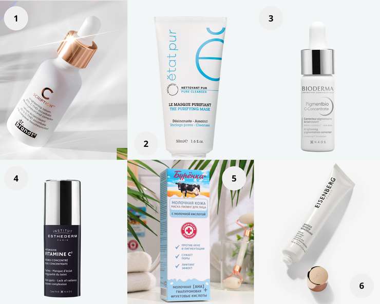 1. Сыворотка С-сияние, dr.brandt. 2. Очищающая экспресс-маска, Etat Pur. 3. Pigmentbio Осветляющая сыворотка С-Concentrate, Bioderma. 4. Intensive Сыворотка Интенсив Витамин C двойной концентрат, Institut Esthederm. 5. Маска-пилинг молочная для лица с молочной и гиалуроновой кислотами, Буренка. 6. Моделирующая и снимающая усталость маска, Eisenberg.