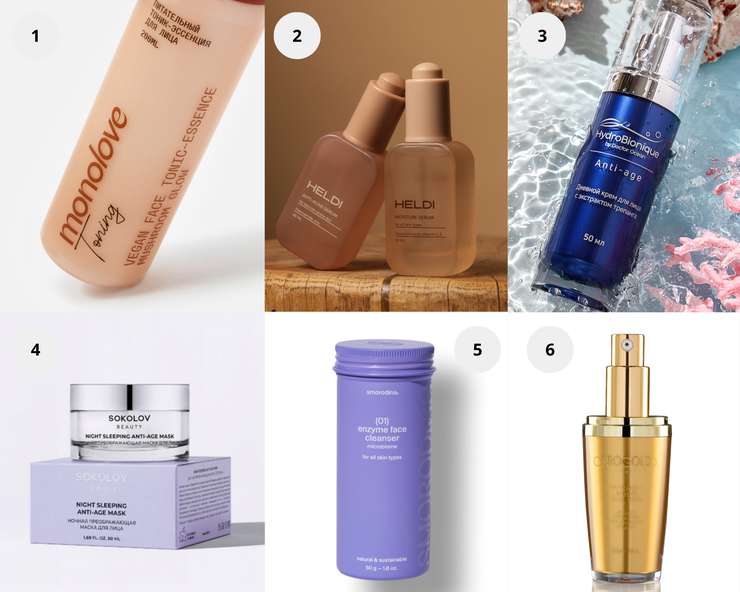 1. Тоник-эссенция для лица Mushroom glow, monolove. 2. Сыворотка для лица увлажняющая, HELDI. 3. Anti-age Дневной крем-филлер с трепангом, HydroBionique. 4. Маска для лица ночная преображающая с мелатонином Night Sleeping Anti-Age Mask, SOKOLOV BEAUTY. 5. Энзимная пудра, SMORODINA. 6. Сыворотка бустер витамин С, OROGOLD.