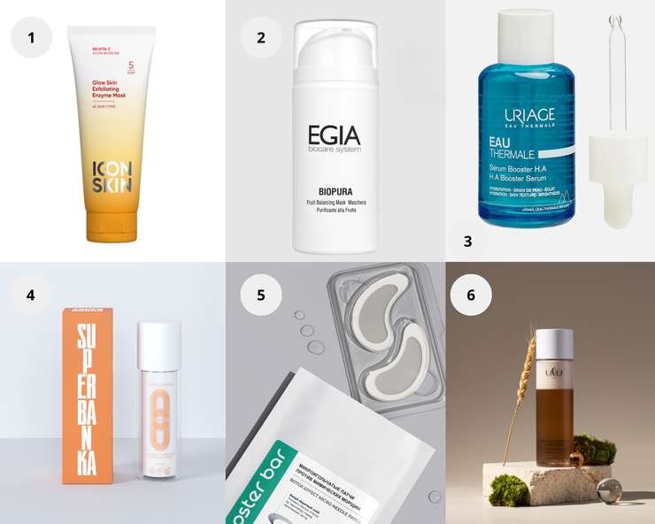 1. Энзимная очищающая маска-гоммаж Glow Skin, Icon Skin. 2. Балансирующая маска с экстрактом фруктов, EGIA Biocare System. 3. О’Термаль Увлажняющая сыворотка-бустер, Урьяж. 4. Сыворотка с витамином с и трипептидом меди Little Miss Sunshine, SUPERBANKA. 5. Микроигольчатые патчи для области вокруг глаз Botox Effect Micro-Needle Patch, Booster Bar. 6. Двухфазный тонер Probiotic Kombucha Dual Toner, ULU.