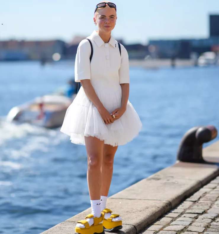 Мини-платье из тюля не обязательно должно кричать «балерина». Давайте для разнообразия изобразим слово «теннис», тем более, что это очень актуальный тренд. Попробуйте сочетать юбку со свитером-поло или свитером тонкой вязки с горловиной и сандалиями на платформе или мокасинами, чтобы выглядеть стильно и современно.