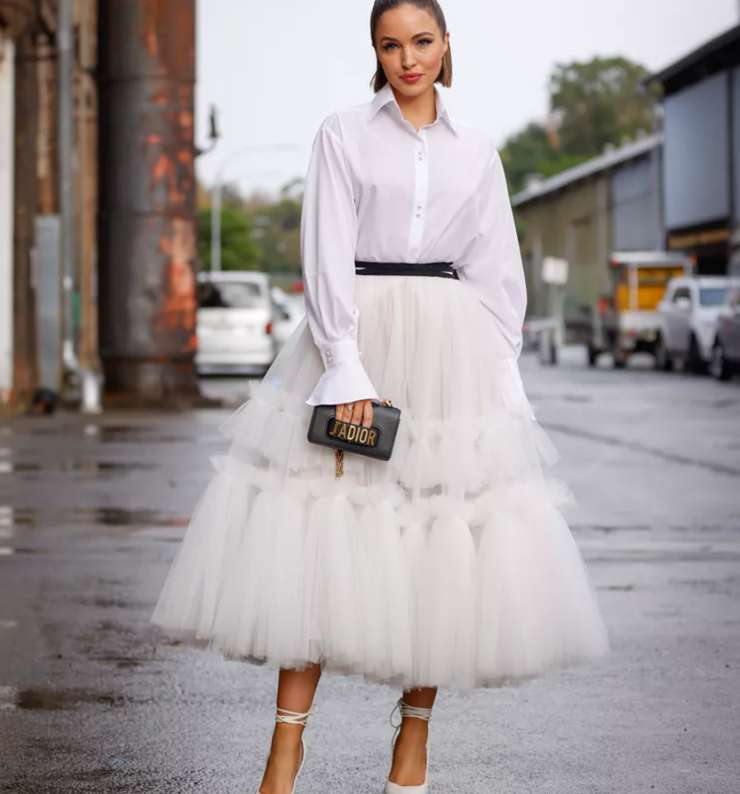 «Хотя майка по-прежнему остается отличным вариантом, существует огромное количество способов стилизовать юбку из фатина. Для простоты наряда можно использовать боди, футболку, пижамный топ, толстовку или худи. Если вы хотите придать юбке из тюля другое звучание, воспользуйтесь блейзером, рубашкой на пуговицах и украшениями.