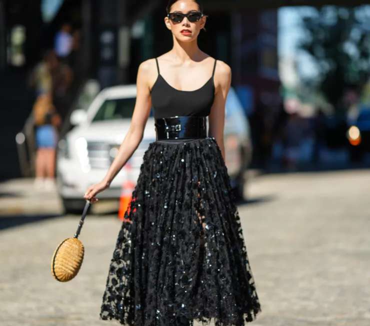 «Юбка из тюля, украшенная пайетками, по-настоящему сияет, если дополнить ее поясом из лакированной кожи, остроносыми мюлями, солнцезащитными очками „кошачий глаз“ и овальной сумочкой из ротанга. Шикарный образ для любой летней вечеринки», — убеждена Маша.