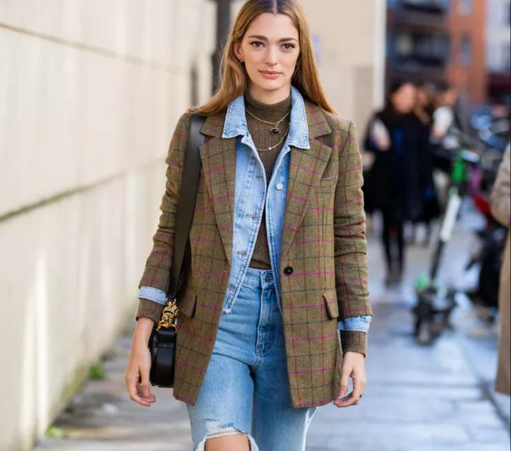 Добавление джинсовой куртки и узорчатого блейзера — шикарный и легко регулируемый вариант. Сочетание вырезов — воротник и что-то высокое — радует глаз и кажется классически зимним. Особенно это сочетание удачно для тех дней, когда или на улице достаточно тепло, чтобы пройтись без пуховика (блейзер меняем на пальто) или, наоборот, в офисе слишком холодно — и одного жакета, кажется, явно недостаточно.