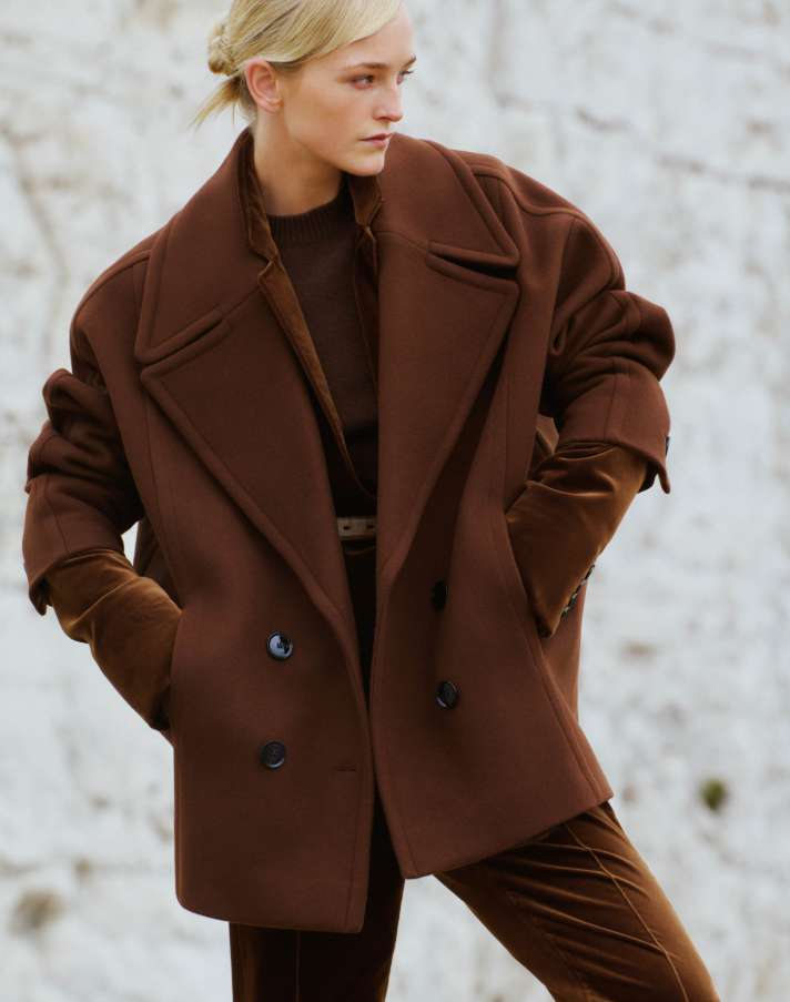 Это все тот же объемный верх, слегка суженный низ, линия падает мягкой дугой. Силуэт комфортный и современный, особенно в длине миди. «Балансируйте объем приталенным или узким низом — джинсы скинни, плотные леггинсы, юбка-карандаш и сапоги с высоким голенищем. Внутри держите гладкий верх: тонкая водолазка, шелковистая блуза, хлопковый лонгслив. Кокон любит фактуру, это букле, вареная шерсть, плотный твид. Цвета можно выбрать более смелые — вино, изумруд, сливовый», — говорит стилист.
