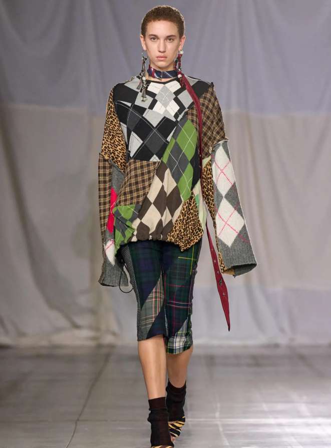 Ромбический узор развернулся из скучноватой академической классики в модный обиход: жилеты, кардиганы, джемперы и платья-трубы с крупным аргайлом. Новое — в масштабе (крупнее обычного), в неожиданных сочетаниях (графит и крем, хвоя и молоко, вишня и сталь) и в стилизации: поверх белой рубашки, под строгий жакет, с кожаной юбкой или широкими брюками. Аргайл — это простая, но динамичная геометрия, которая добавляет образу интеллигентности без занудства.