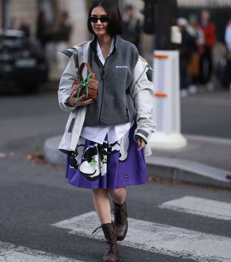 Отличный пример того, как спортивный гардероб стал частью городской эстетики. Толстовка из флиса прекрасно смотрится с трикотажной юбкой или миди из плотной шерсти. Чтобы образ не выглядел случайным, можно добавить ремень, высокие сапоги и структурную сумку. Так спортивная ткань неожиданно работает на женственность.
